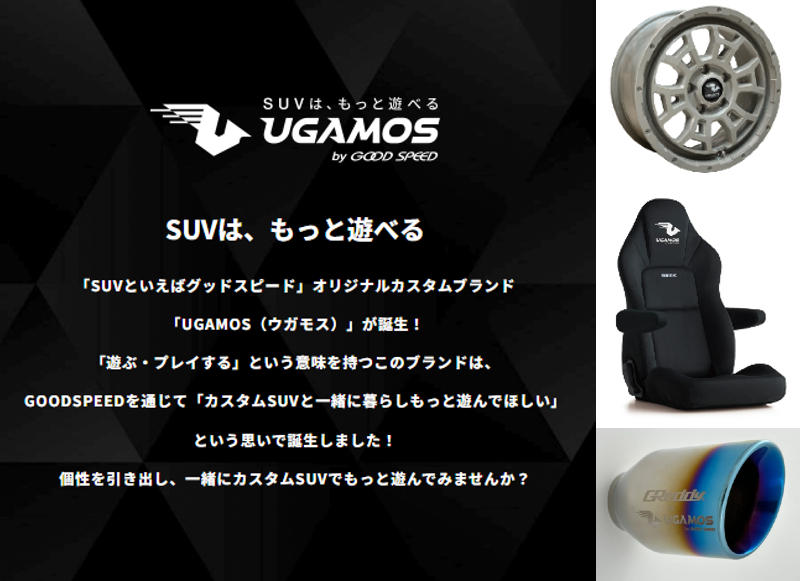 「SUV といえばグッドスピード」をキャッチコピーに掲げる、2022年度東海エリアにおけるSUV 販売台数7,000台以上の株式会社グッドスピード(代表取締役社長:加藤久統、本社:愛知県名古屋市東区、証券コード:7676 東証グロース、以下 当社)は、SUV カスタムの新プライベートブランド「UGAMOS(ウガモス)」を立ち上げましたのでお知らせします。