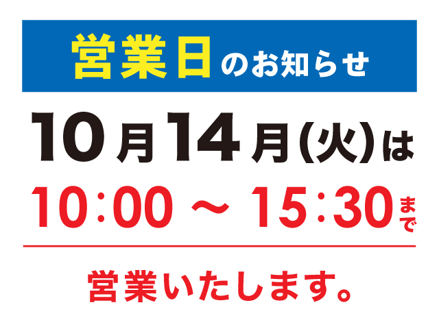 2025年10月14日(火)は「10:00~15:30」までを店舗の営業日とさせていただきます。