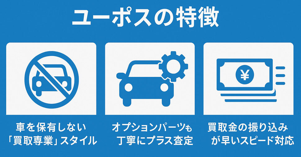 ユーポスの大きな特徴は「買取専業スタイル」にあります。自社で在庫を保有せず、買取後の車両はすぐにオークションに出品する仕組みを採用しています。